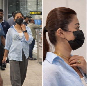 रश्मिका ने अपने साधारण और आरामदायक पहनावे को आकर्षक आभूषणों से सजाया, जिनमें उनकी हीरे की शादी की अंगूठी, कई लड़ियों वाला हार और एक स्टाइलिश घड़ी शामिल थी। बालों को पोनीटेल में बांधकर और हल्का मेकअप करके उन्होंने एयरपोर्ट लुक को पूरा किया।