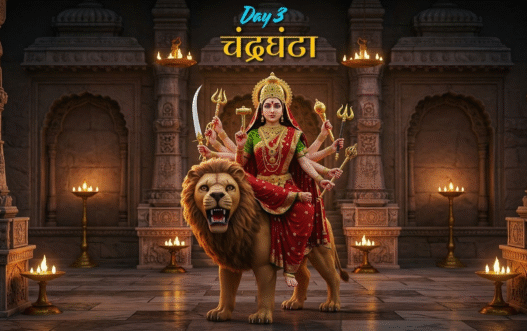 चैत्र नवरात्रि के तीसरे दिन माँ चंद्रघंटा की उपासना की जाती है। देवी का यह स्वरूप अत्यंत शांतिदायक और कल्याणकारी है। इनके माथे पर घंटे के आकार का अर्धचंद्र सुशोभित है, जिसके कारण इन्हें चंद्रघंटा कहा जाता है। स्वर्ण के समान चमकीले वर्ण वाली देवी के दस हाथ हैं, जिनमें कमल, धनुष-बाण, तलवार, त्रिशूल और गदा जैसे अस्त्र-शस्त्र विराजमान हैं। इनका वाहन सिंह है, जो साहस का प्रतीक है।